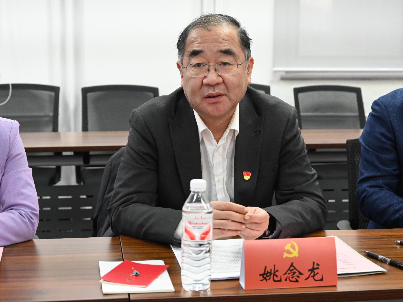 姚念龙和学院教师党员代表为党支部新发展党员佩戴党徽并发放《中国共产党章程》等相关学习资料。